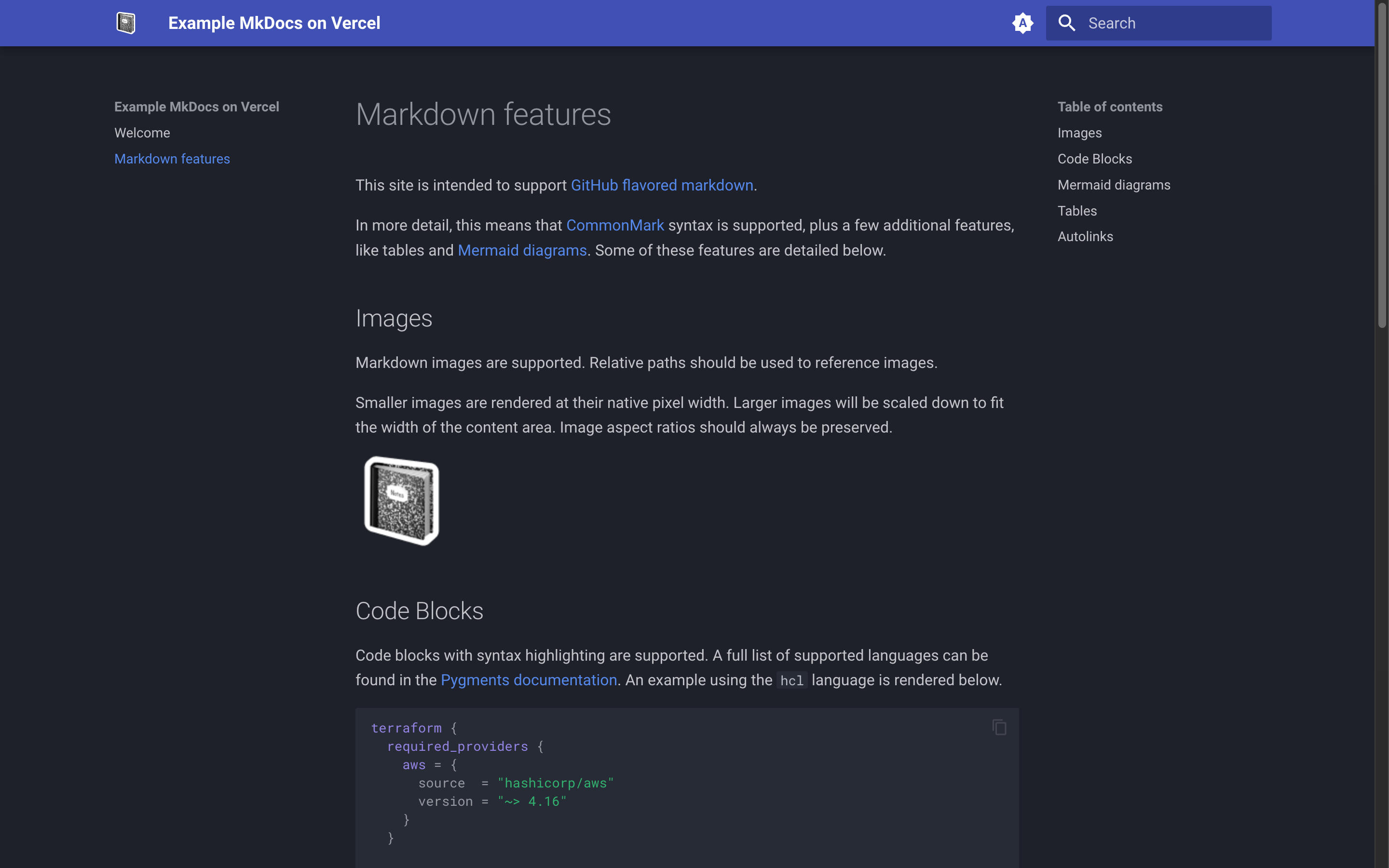 I was recently introduced to MkDocs. It feels like a great way to solve this problem in a simple way, with minimal configuration. But I’m also really used to using Vercel, and I wanted to be able to deploy a Python-based MkDocs setup to Vercel as easily as any Node-based static site.