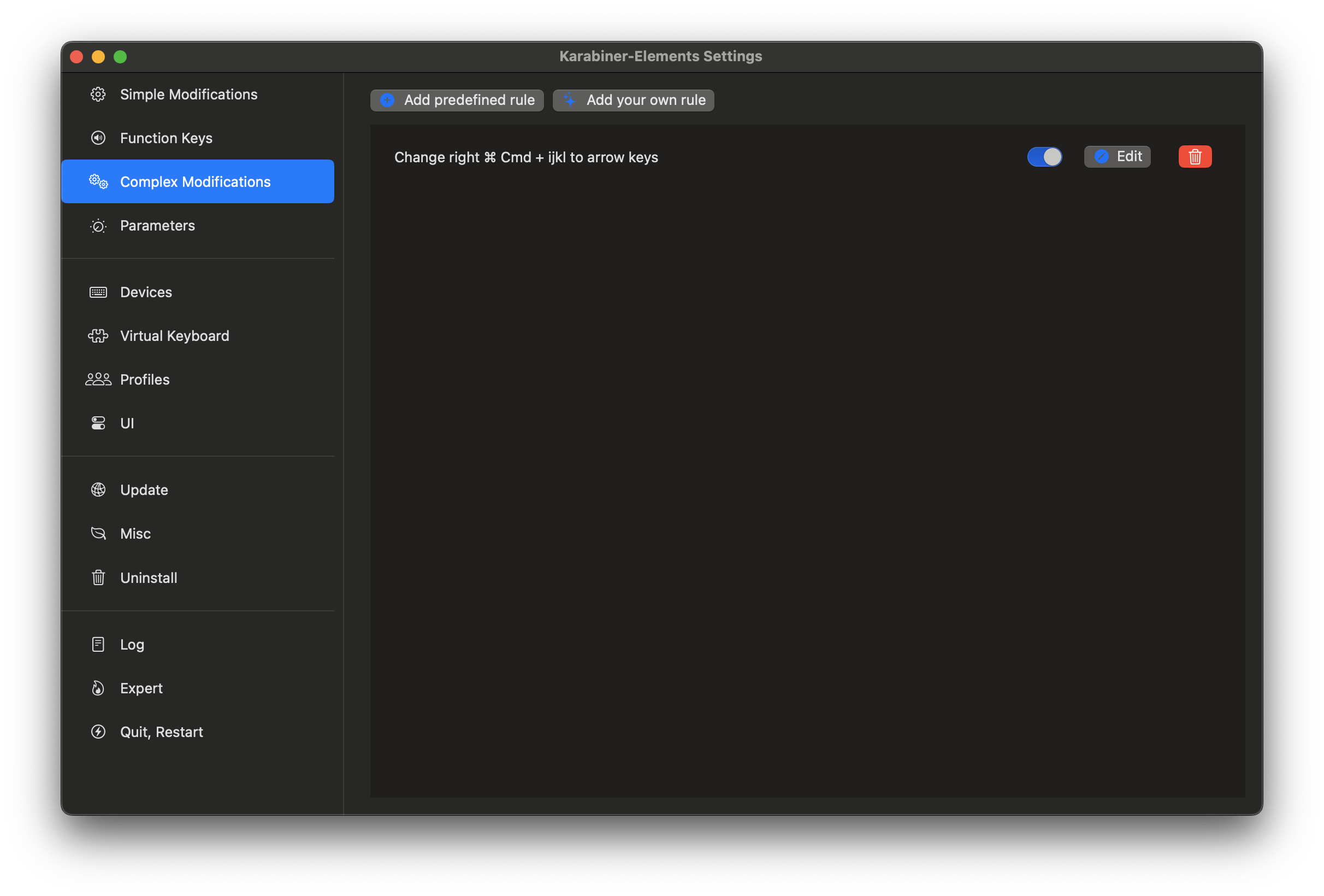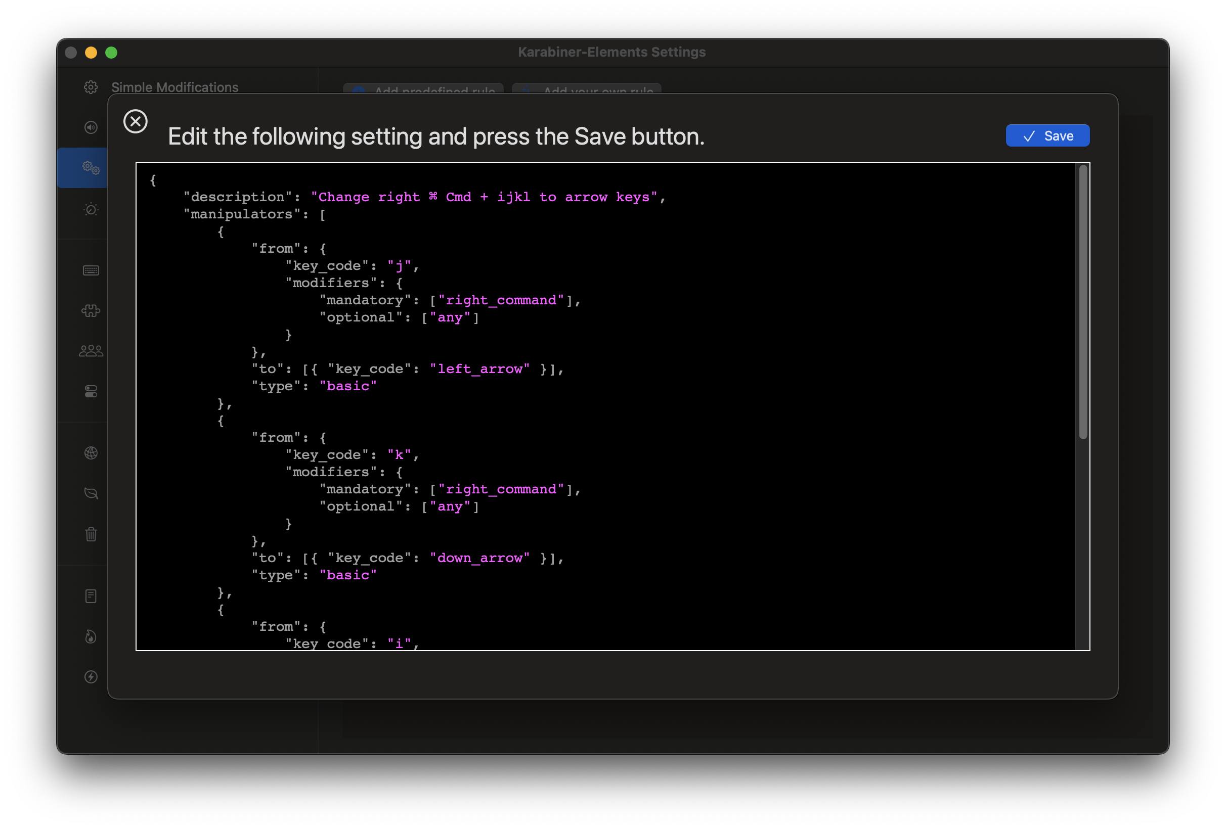 Select Add your own rule. You should see a big ol’ input field show up, with some placeholder JSON. The JSON linked below is what I use to map the right ⌘ Cmd + ijkl to arrow keys. I’ve also included it in a code block at the bottom of this page in case that’s easier to copy.