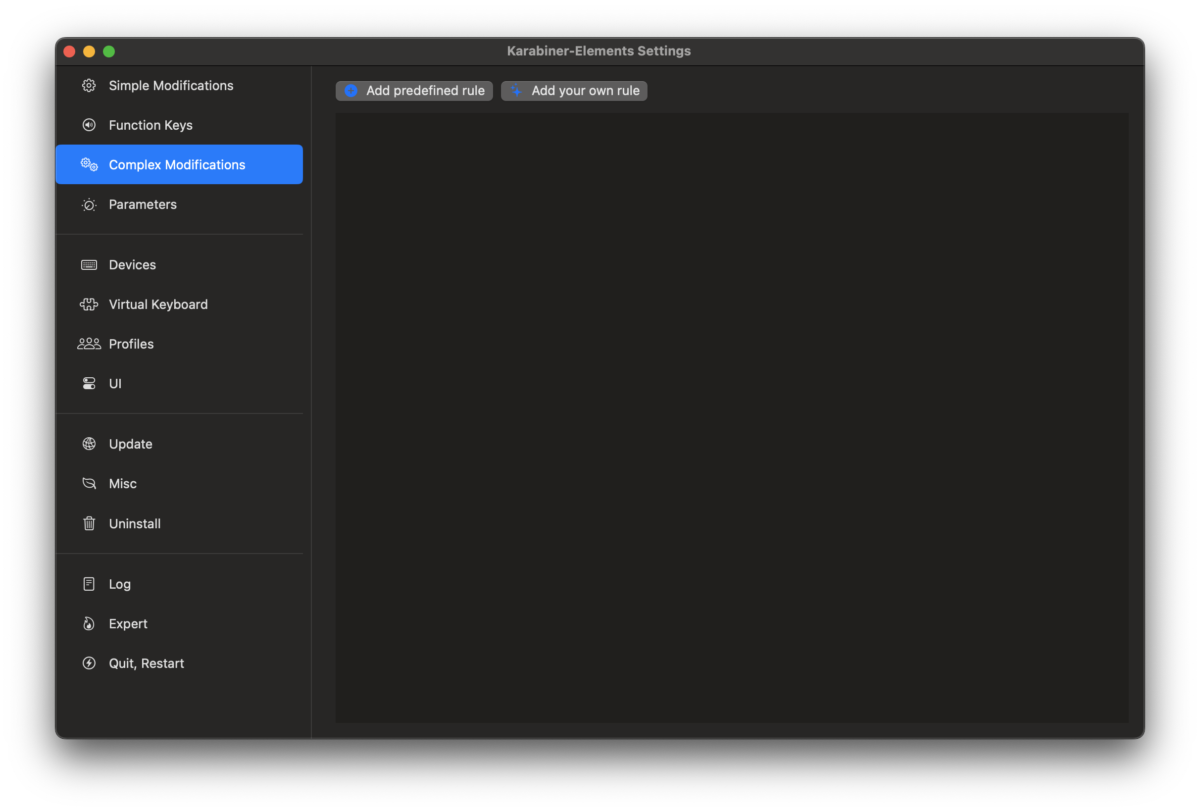Once you’ve finished following the installation steps, open Karabiner’s preference pane if it isn’t open already, and head over to Complex Modifications. The pane will look empty, this is okay!